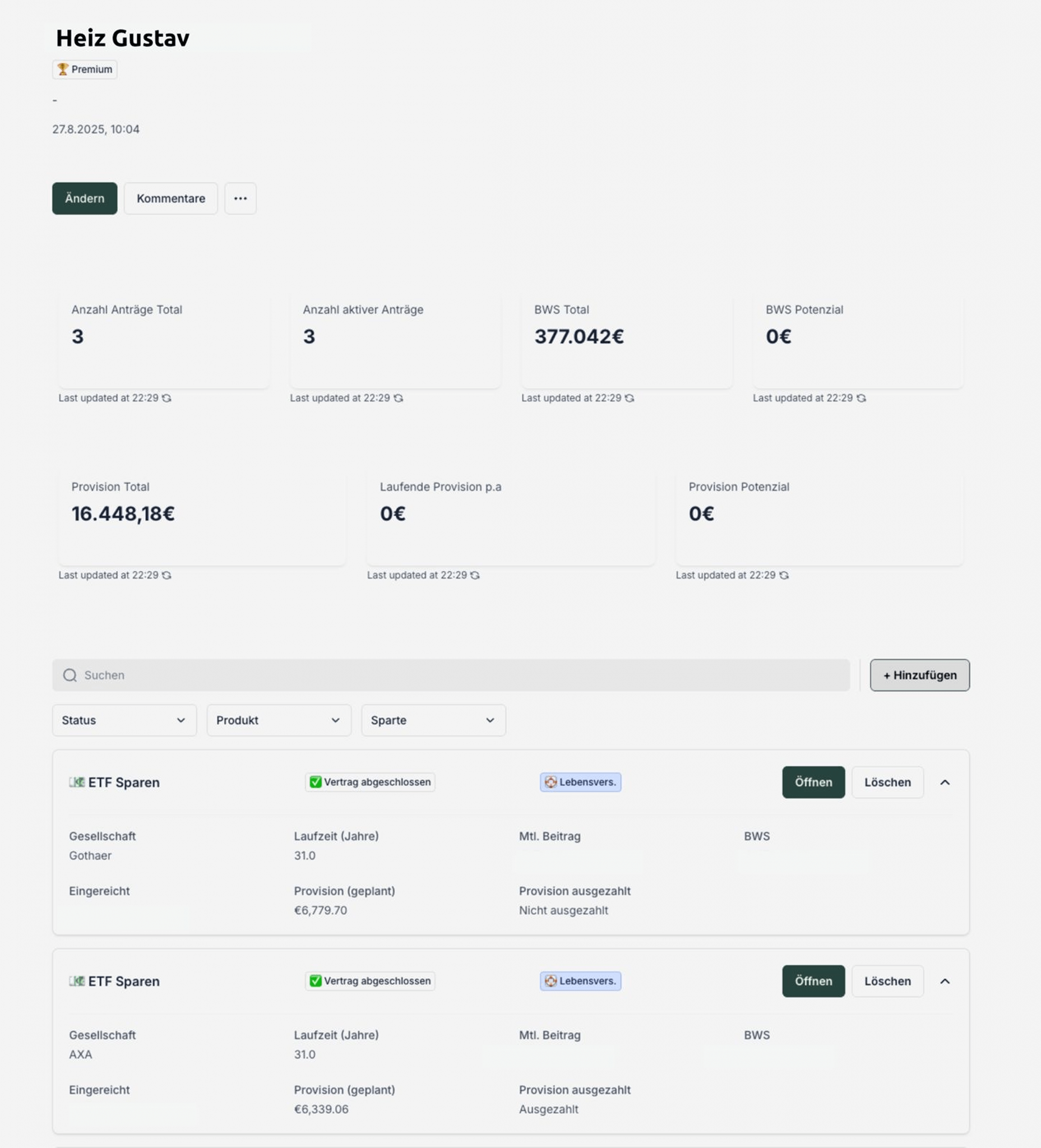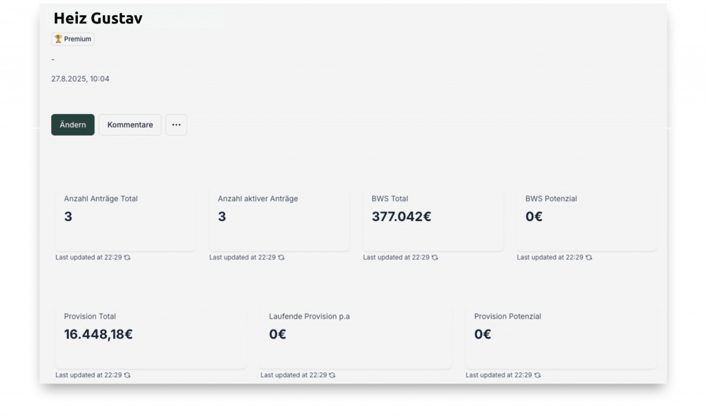 Sieh aktive und eingereichte Vertäge, erzielten Umsatz und BWS jedes Kunden – inklusive Datum, Status und Produktzzuordnung klar nachvollziebar
