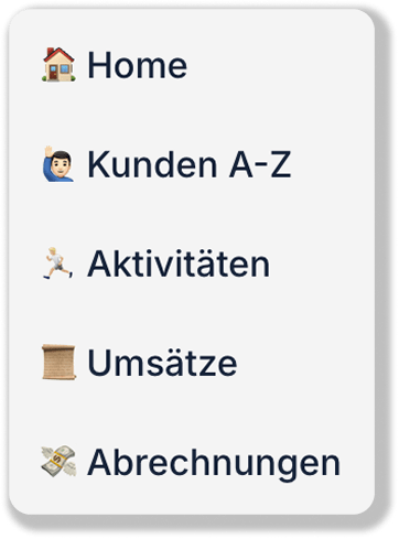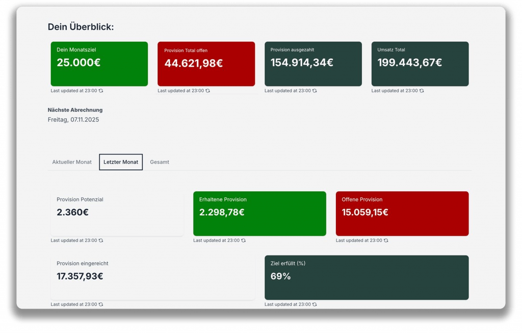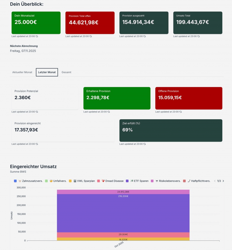 Sieh auf einem Blick, welche Kunden, Verträge und Produkte, wirklich Umsatz bringen. Behalte deine Ziele, offene Provisionen und Entwicklung im Blick, ohne Excel-Listen und manuelles Nachpflegen